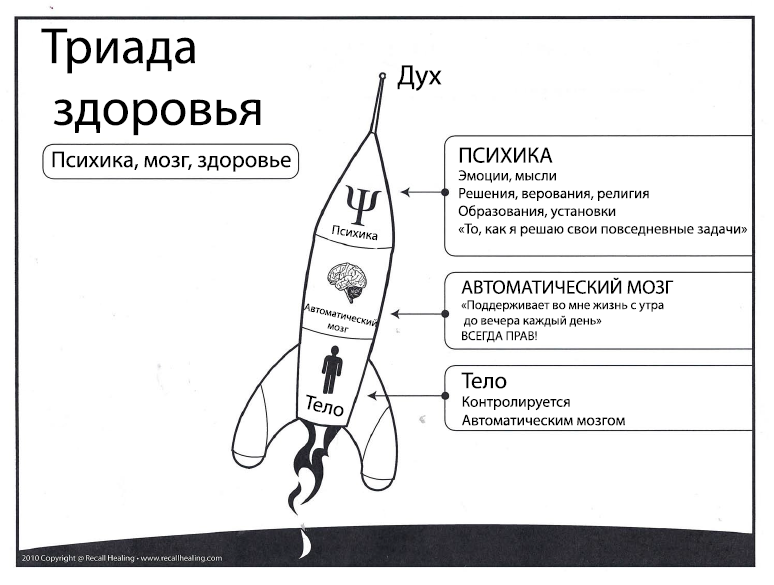 На практике, ведущий с помощью определенных психологических техник, позволяет клиенту найти и разрядить психологический конфликт, лежащий в основе соматической проблемы (заболевания). Мы рассматриваем триаду здоровья следующим образом: